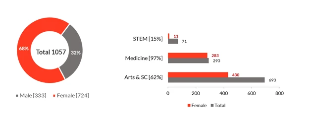 ÃÜÌÒÊÓÆµ continues to demonstrate steady progress in advancing gender balance in graduation rates, reflecting the positive impact of its support mechanisms. In 2024, the total number of graduates rose to 1,057, with 724 female graduates (representing 68% of the cohort).